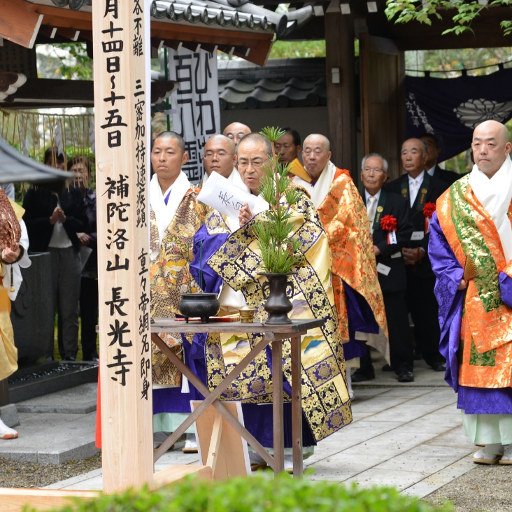 補陀洛山 長光寺は、滋賀県近江八幡市長光寺町にある弘法大師を宗祖とする高野山真言宗の寺院です。聖徳太子建立四十九院の寺院の一つで、御本尊は『千手子安観世音菩薩』で正面に本堂、右に大師堂、左に不動堂を配します。境内には高さ約15メートル、周囲約3メートルの巨木があります。これは日本最南限に生息するハナノキで近江八幡市の天然記念物に指定されています。